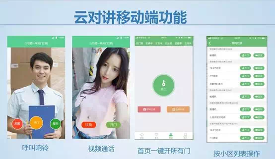 可视化移动端智能云对讲系统,再也不用呆在家里才能应用小区对讲系统了。下载云对讲移动端APP,连接网络,支持各类网络以及信息认证,呼叫响铃,视频通话,一键开门。